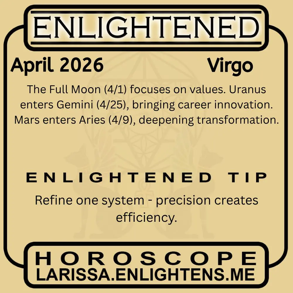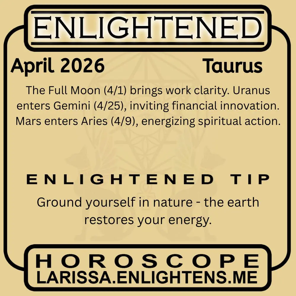 The Full Moon (4/1) brings work clarity. Uranus enters Gemini (4/25), inviting financial innovation. Mars enters Aries (4/9), energizing spiritual action.