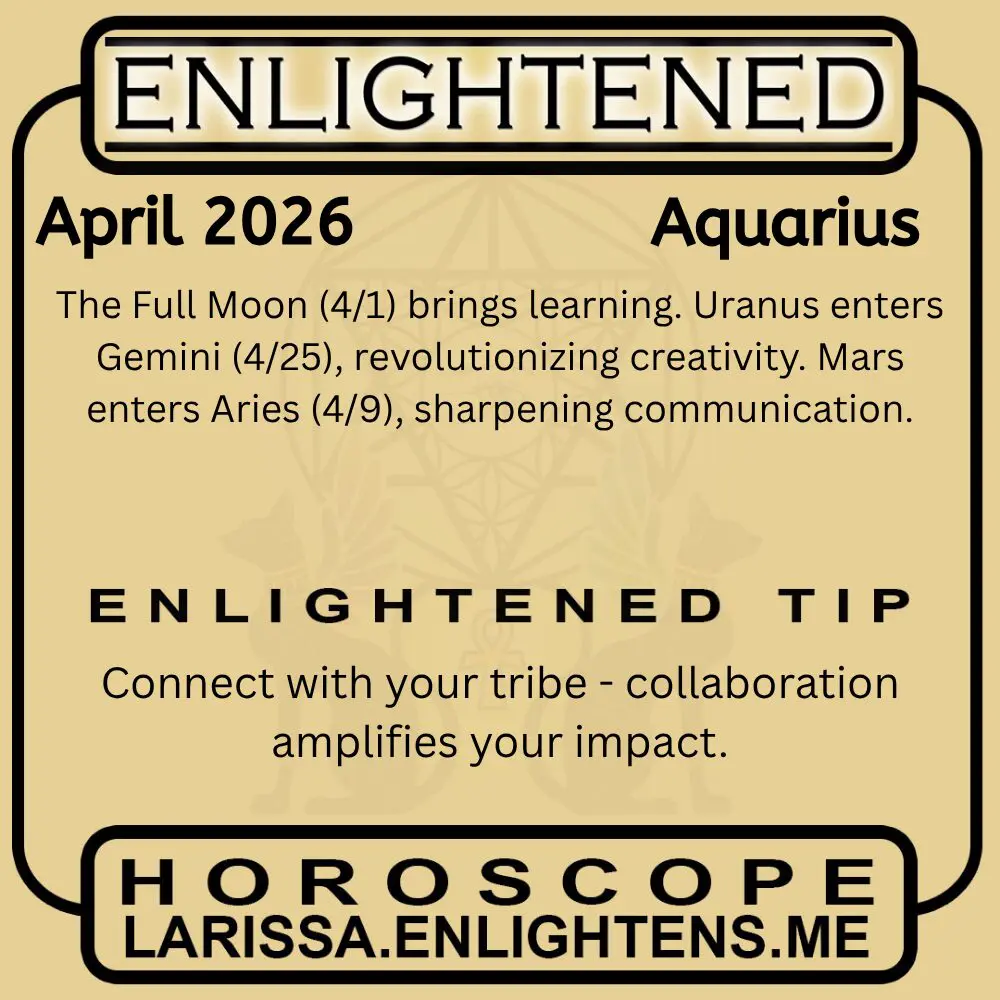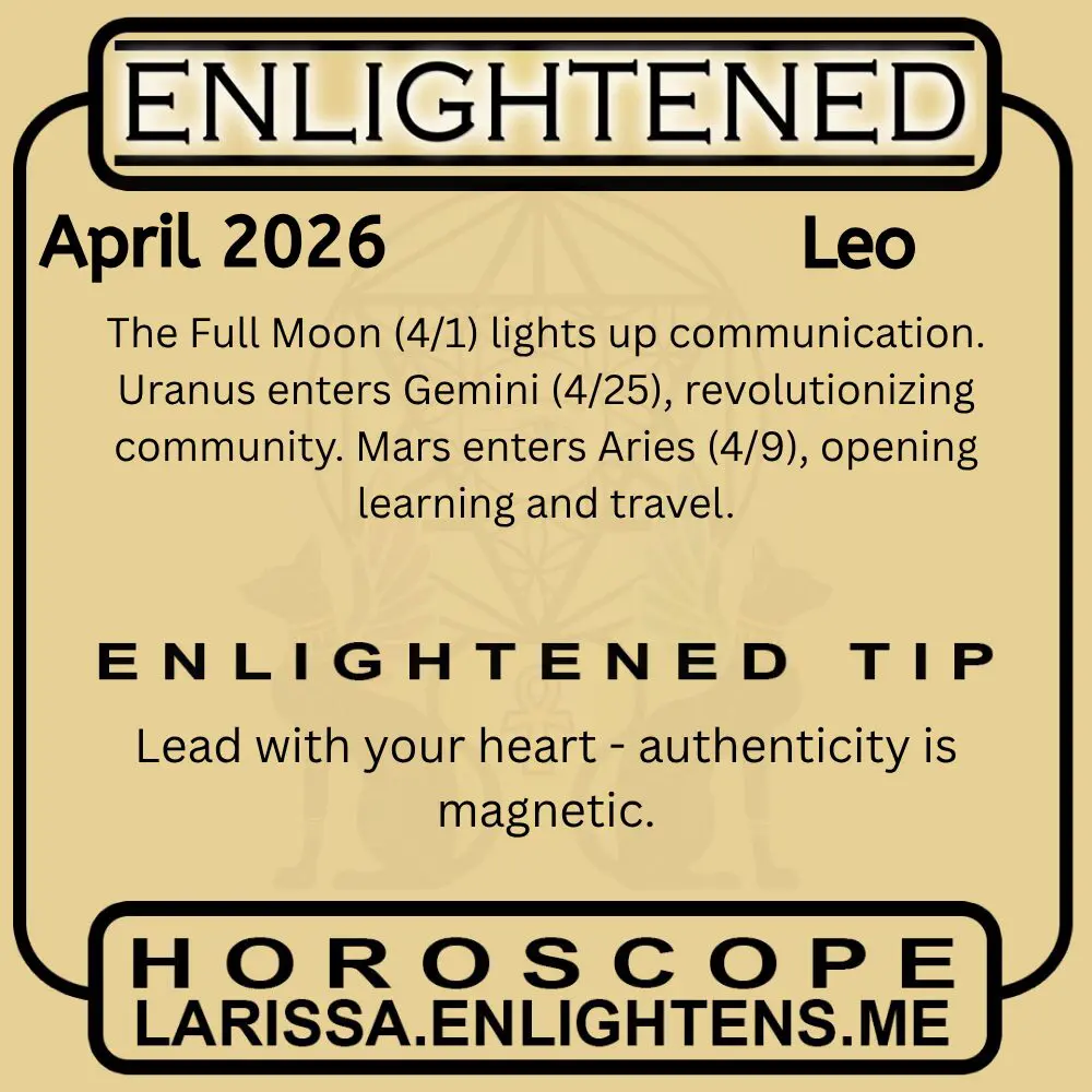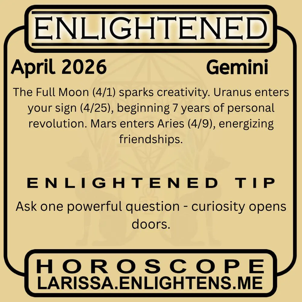 The Full Moon (4/1) illuminates partnerships. Uranus enters Gemini (4/25), beginning a 7-year cycle of communication revolution. Mars enters your sign (4/9), amplifying energy.