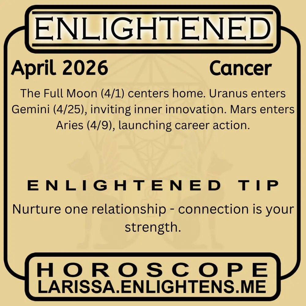 The Full Moon (4/1) centers home. Uranus enters Gemini (4/25), inviting inner innovation. Mars enters Aries (4/9), launching career action.