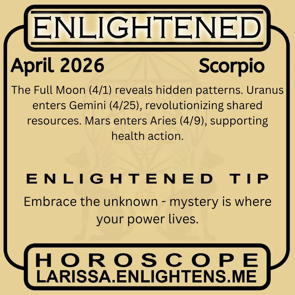 The Full Moon (4/1) reveals hidden patterns. Uranus enters Gemini (4/25), revolutionizing shared resources. Mars enters Aries (4/9), supporting health action.