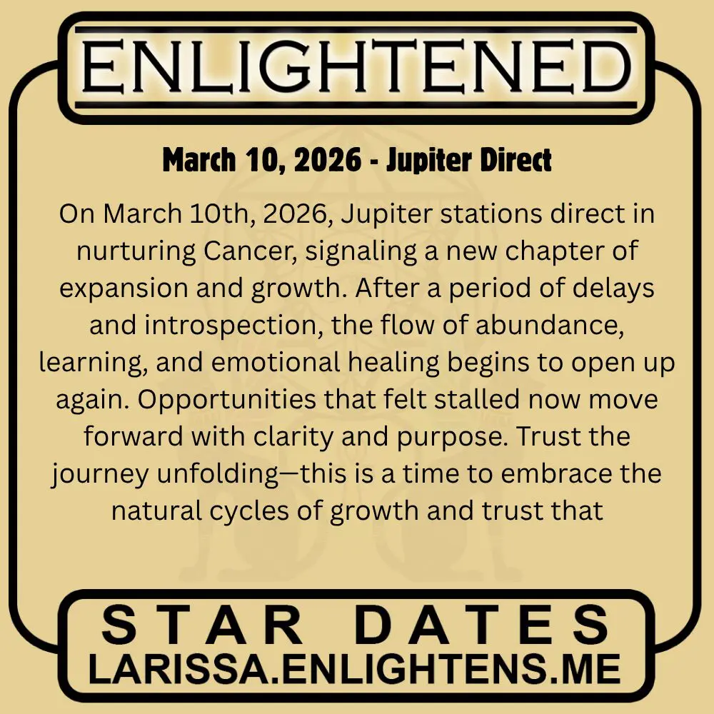 Expansion resumes. Jupiter stations direct on March 10th in Cancer, clearing delays in growth, learning, and emotional abundance. What felt blocked now flows. Trust the journey.